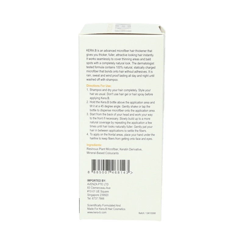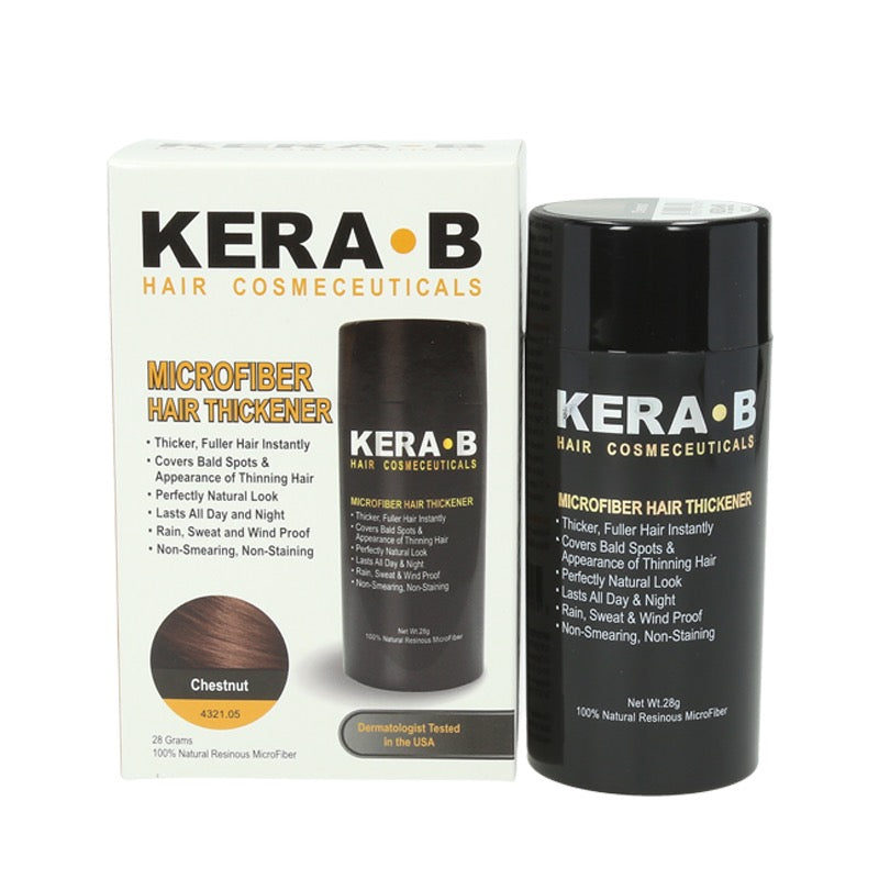 Kera B is an advanced microfiber hair thickener that gives you thicker, fuller, attractive looking hair instantly. It works seamlessly to cover thinning areas and bald spots with a completely natural look. The dermatologist tested formula contains 100% natural, statically charged microfiber that bonds onto hair without adhesives. It is rain, sweat and wind proof lasting all day and night until washed off with shampoo.