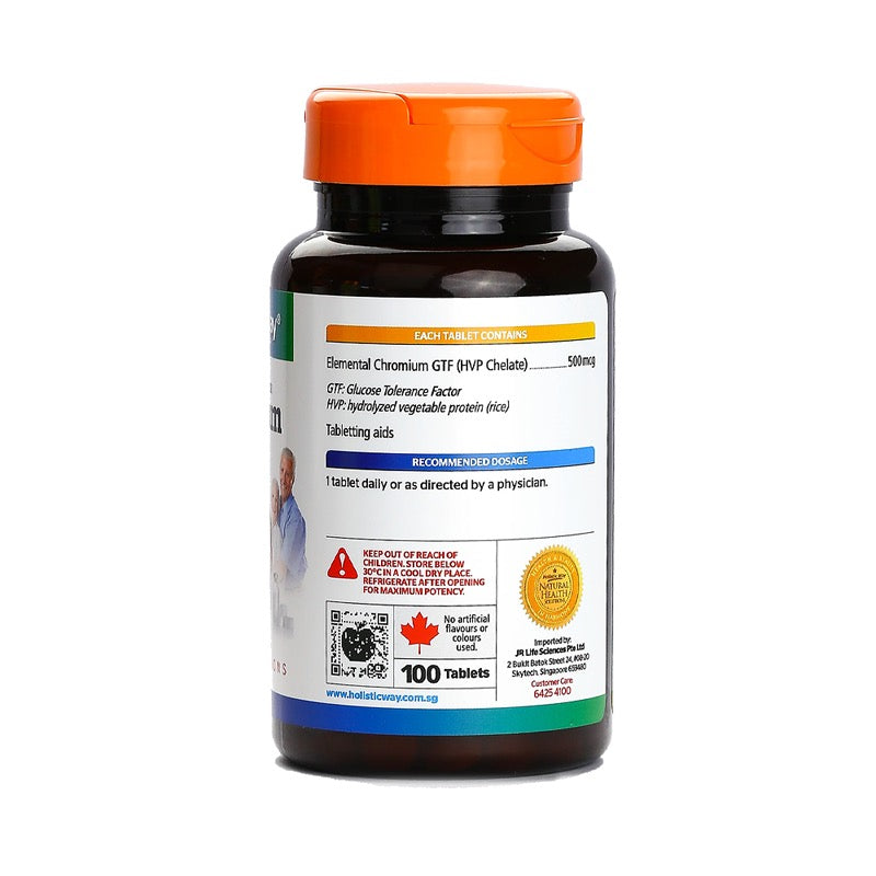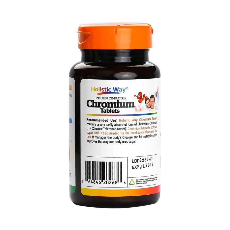 Holistic Way Chromium Chelate contains a very easily absorbed form of Chromium, Chromium GTF (Glucose Tolerance Factor). Chromium helps the body use sugar and is also needed for the breakdown of proteins and fats. It manages the body’s glucose and fat metabolism, thus improves the way our body uses sugar. Each tablet contains: