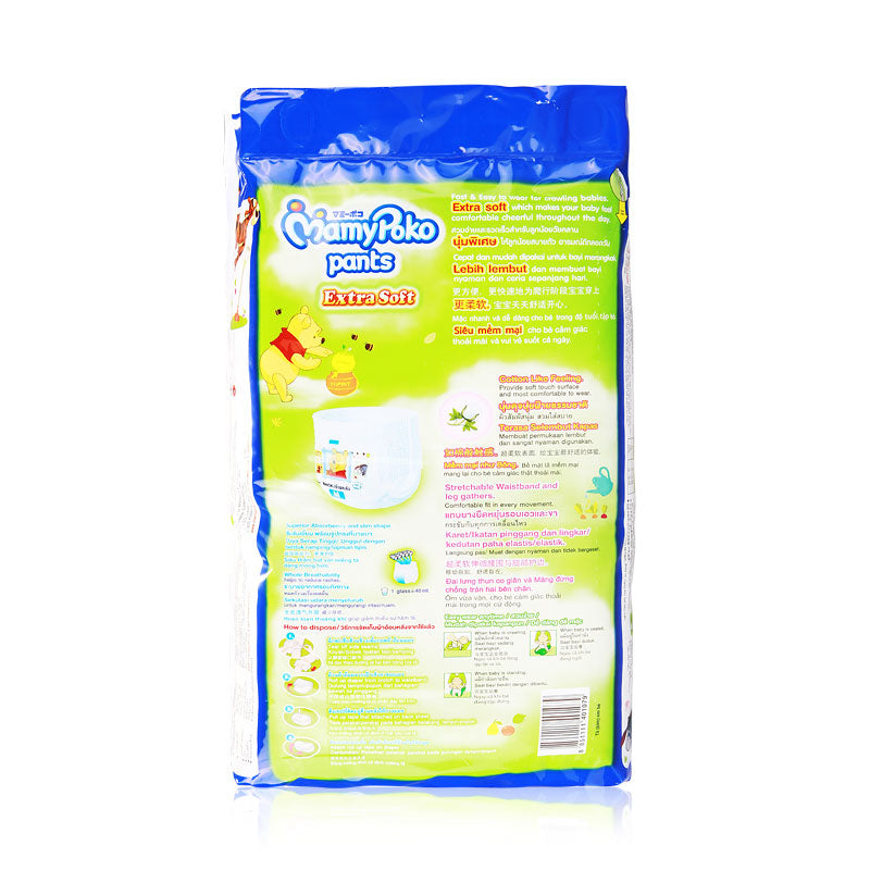 MamyPoko Extra Soft Pants Boys and Girls emphasize absorbency by gender (not available for size M) and have roll up tape for convenience of all mums and dads to dispose diapers hassle and mess free.