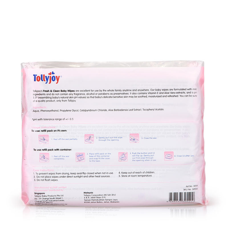 Tollyjoy's Fresh & Clean Baby Wipes are excellent for use by the whole family anytime and anywhere. Our baby wipes are formulated with mild ingredients and do not contain any fragrance, alcohol or parabens as preservatives. It also contains Vitamin E and Aloe Vera extracts, and is pH5.5* (resembling baby's natural skin pH values) so that baby delicate/sensitive skin may be soothed, moisturized and refreshed. You can be sure of a quality product, only from Tollyjoy.