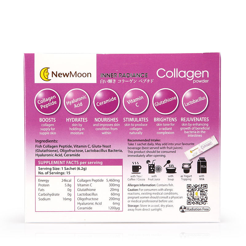New Moon Inner Radiance Collagen Powder contains Collagen Peptide, Hyaluronic Acid, Ceramide, Vitamin C, Glutathione and Lactobacillus to nourish and brighten your skin for a supple and radiant complexion.
