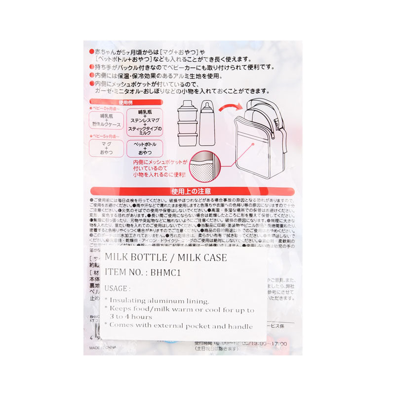 Keeps food/milk warm or cool for up to 3 to 4 hours. Comes with external pocket and handle.