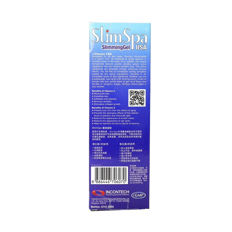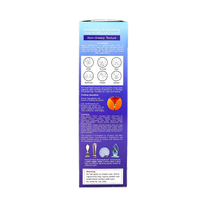 SlimSpa SlimGel is a topical “rich” gel, developed for all skin types and designed to target deposits in troubled areas of the body. Once applied, the unique transdermal delivery quickly shuttles potent active ingredients into the chosen problem area. You will feel an immediate cooling sensation caused by the active ingredients, resulting in an immediate sense of skin tightening. Moisturizing & nourishing. Leaves skin feeling soft and smooth. Non-Greasy texture.