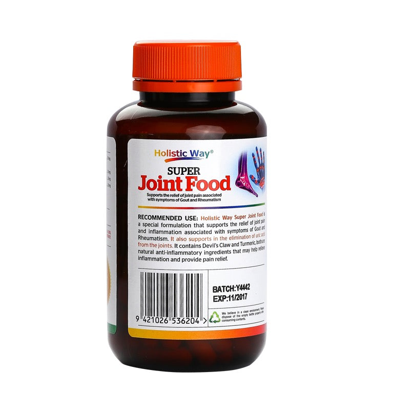 HW Super Joint Food is a special formulation that supports the relief of joint pain & inflammation associated with symptoms of Gout & Rheumatism. It also suppports in the elimination of uric acid from the joints & improves joint function. It contains Devil’s Claw & Turmeric, both are natural anti-inflammatory ingredients which are used traditionally for supporting relief of joint pain & inflammation. Each Vcap contains: