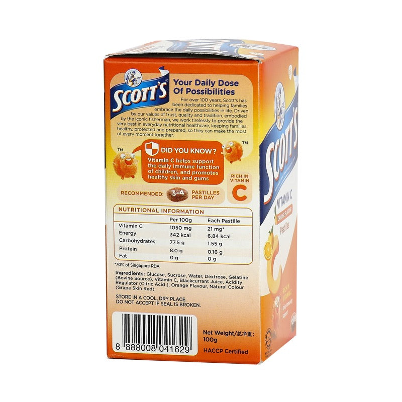 For over 100 years, Scott’s has been dedicated to helping families embrace the daily possibilities in life. The iconic fisherman has become the brand’s icon of reliability and quality, symbolizing our effort in safeguarding each family’s growth and development. We work tirelessly to provide the very best in everyday nutritional healthcare, keeping families healthy, protected and prepared, so they can make the most of every moment together. Scott's Vitamin C Pastilles is rich in vitamin C, which helps support your child’s daily immune system. It helps in the absorption of iron and promotes healthy skin and gums too.