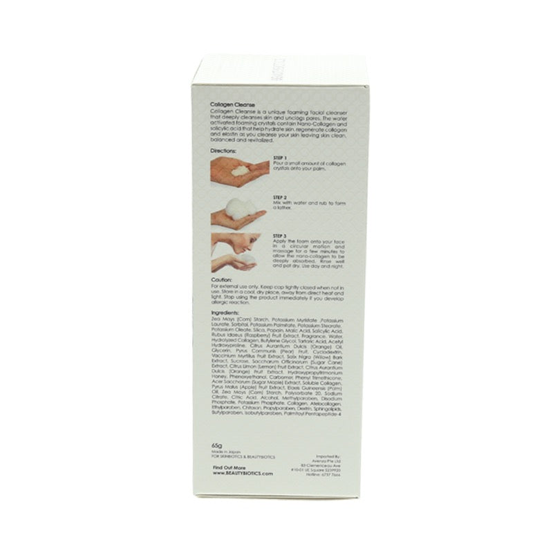 Collagen cleanse is a unique foaming facial cleanser that comes in a powdered form which is then turned into a foaming cleanser when mixed with water. The foam particles created by the collagen cleasne are sp fine tha tthey can thoroughly removw impurities from the pores, yet the release of Nano-collagen keeps the skin well hydrated.