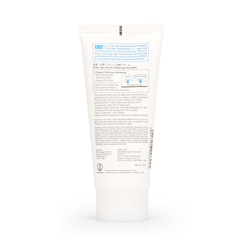 Hada Labo is a skin care line researched & developed by Rohto Pharmaceutical Co. Japan and The Mentholatum Co. With a philosophy 'Perfect X Simple', Hada Labo uses only the purest ingredients that are beneficial to the skin, with no unnecessary addictives & manufactured under strict pharmaceutical standards. Hada Labo Arbutin Whitening Face Wash is enriched with Arbutin and plant extracts for double whitening effect. It helps restore and optimize skin's evenness for visibly fair & radiant skin. It also contains Super Hyaluronic Acid that penetrates into skin to hydrate intensely, leaving skin soft and supple. Skin PH is balanced without causing irritation. Free of fragrances, alcohol, mineral oil and and colorant.