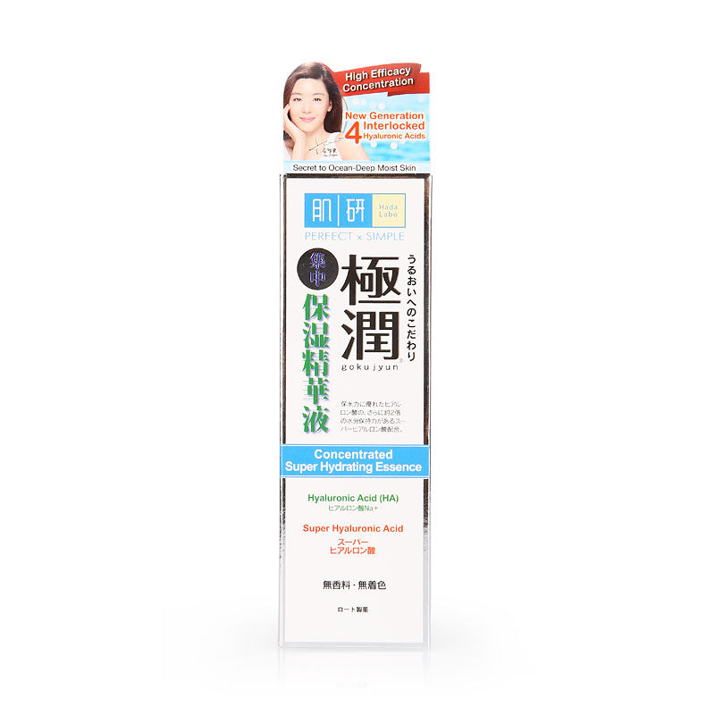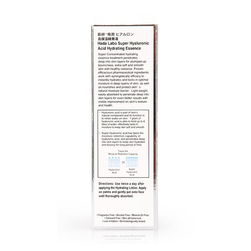 Hada Labo is a skin care line researched & developed by Rohto Pharmaceutical Co. Japan and The Mentholatum Co. With a philosophy 'Perfect X Simple', Hada Labo uses only the purest ingredients that are beneficial to the skin, with no unnecessary addictives & manufactured under strict pharmaceutical standards. Hada Labo Super Hyaluronic Acid Hydrating Essence treatment penetrates deep into skin layers for plumped-up bounciness, extra soft and smooth skin with healthy radiance. Proven efficacious pharmaceutical ingredients work with synergistically efficacy to instantly hydrate and lock optimal moisture in deep layers of skin, as well as nourishes and protect skin's natural moisture barrier. Light-weight, easily absorbed to penetrate deep into skin layers for even better results with visible improvement on skin's texture and health. Dermatologically tested, skin PH is balanced without causing irritation. Free of fragrances, mineral oil, alcohol and colorant.