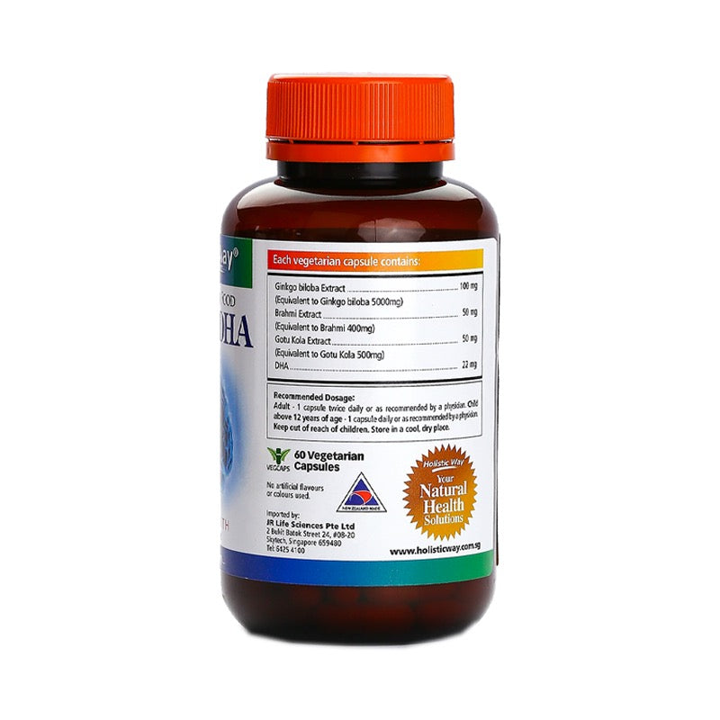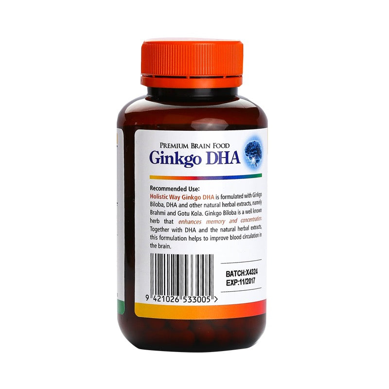 Holistic Way Ginkgo DHA is formulated with Ginkgo Biloba, DHA and other natural herbal extracts, namely Brahmi and Gotu Kola. Ginkgo Biloba is a well known herb that may help in memory and concentration. Together with DHA and the natural herbal extracts, this formulation may help to improve blood circulation in the brain. Each vegetarian capsule contains:
