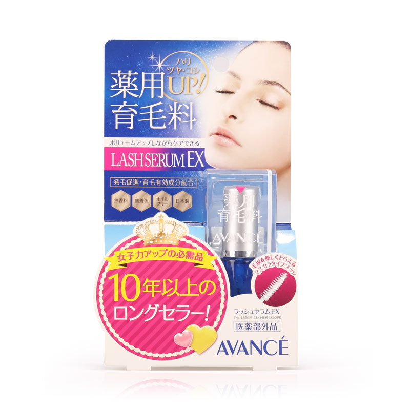 AVANCÉ Lash Serum EX 7ML - Best seller in AVANCÉ for prevention of eyelash loss and growth promoting. A medicated lash growth serum that encourages new hair growth, nurtures existing hair, and combats hair loss. Its active ingredients (pantothenic acid derivative and photosensitive pigment) encourage circulation at the roots and guard against hair loss. Carrot extract and chitin liquid moisturizers enhance the effects of the active ingredients and moisturize lash tips. The active ingredient of Lash Serum EX includes Silk Essence, Hyaluronic Acid, Pantothenic Acid etc. It protect the eyelashes from further damage after a long time usage of eyelash curler and mascara. It comes in a mascara brush type that makes it easy to apply on eyelashes.