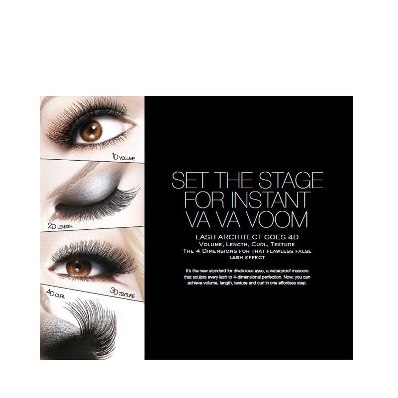 The power of sculpting fibres for lashes that look volumised,lengthened,texturised,curved.Innovation:False lash effect mascara in 4D by L'Oréal Paris:Introducing for L'Oréal's first time sculpting-fibres in a mascara.Enriched with undetectable and ultra-supple 4mm fibres,the formula builds up lashes:moulding,re-shaping and sculpting without hardening or stiffening.Lashes step into 4D:they look volumised,lengthened,texturised and curved,your look is captivating from every angle!