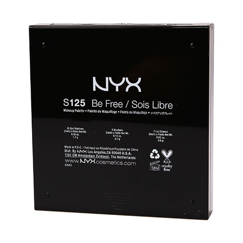 A compact palette of eyeshadows, blushes and lip glosses. NYX Be Free Palette provides you with all the essentials needed to create an endless array of looks for both day and night. Highlight your eyes, lips and cheeks with rich pigment and long-wearing formulas. The mirrored palette features 25 jewel-tone, matte and shimmer eyeshadows, 3 blushes, 7 pigmented lip glosses and 3 brushes to apply each product.