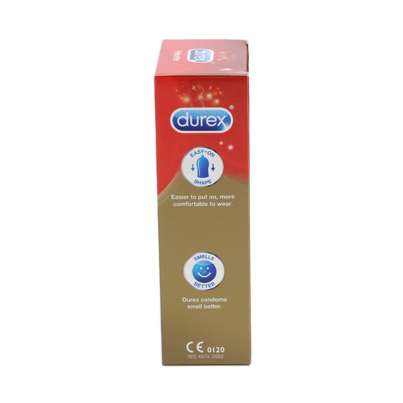 Durex doesn't just meet worldwide condom quality standards, it exceeds them, giving you the confidence to love the sex you have. 1. Nominal width 52.5mm. 2. Transparent, lubricated and teat ended. 3. Easy On shape. Durex Easy-On condoms are shaped to be easier to put on and more comfortable to wear. 4. The special way we make our condoms means they smell better so there are no unpleasant distractions, you can just relax and enjoy. 5. Dermatologically tested. 6. 100% electronically tested.