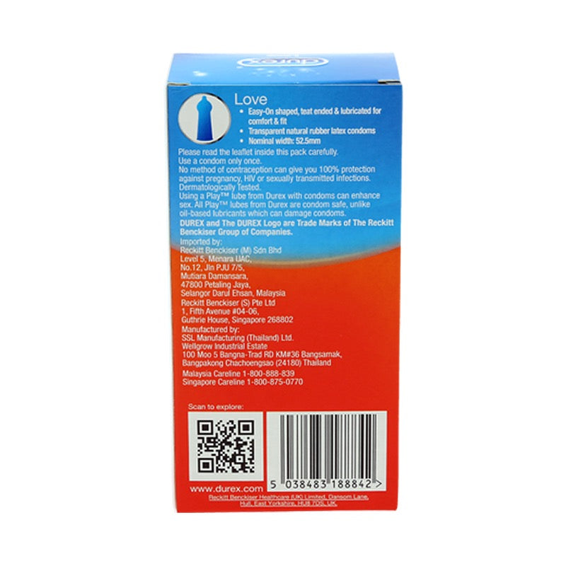 Durex doesn't just meet worldwide condom quality standards, it exceeds them, giving you the confidence to love the sex you have. 1. Nominal width 52.5mm. 2. Easy on shaped, teat ended and lubricated for comfort & fit. Durex Easy-On condoms are shaped to be easier to put on and more comfortable to wear. 3. Transparent natural rubber latex condoms. 4. The special way we make our condoms means they smell better. 5. Dermatologically tested. 6. 100% electronically tested.