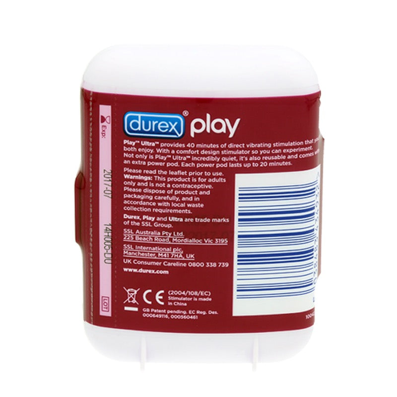 Use it with the power pod at the top of the penis for invigorating, sizzling stimulation for her with the added vibrating contact or use it underneath the penis for thrilling sensations for him. Take time to enjoy foreplay. Relax, massage, touch one another wherever it feels good. When you are really ready for sex, use Play Ultra! It is easy to switch on and off. If you're using a condom be sure to put that on first and take care not to damage the condom when you put the ring on.
