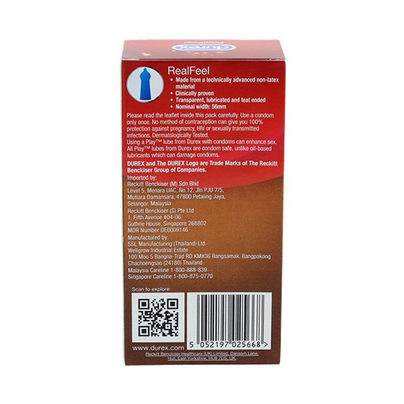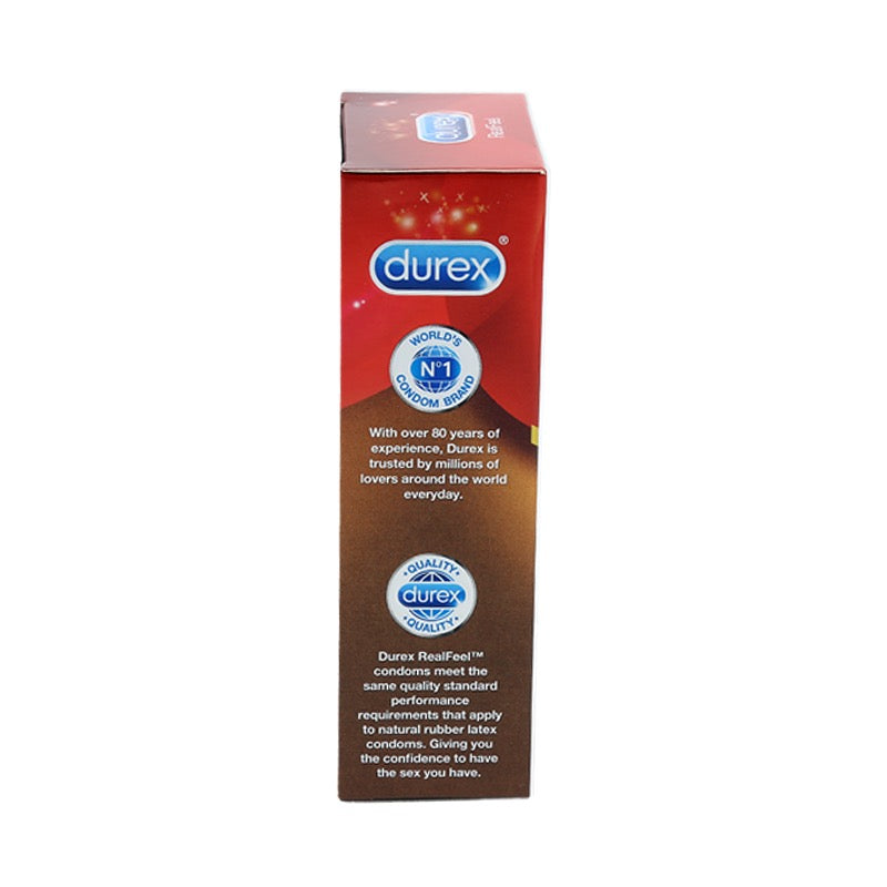 Durex doesn't just meet worldwide condom quality standards, it exceeds them, giving you the confidence to love the sex you have. 1. Natural skin on skin feeling. The next generation condoms with RealFeel material. 2. Clinically proven. 3. Made from a technically advanced non-latex material. 4. Nominal width: 56mm. 5. Transparent, lubricated and teat ended. 6. The special way we make our condoms means they smell better. 7. Dermatologically tested. 8. 100% electronically tested.