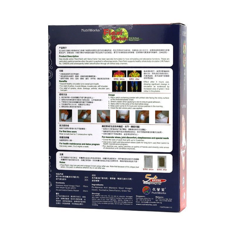 Flexi-Patch with proprietary Mandarin wood vinegar from Korea is the only clinically tested foot patch. Great for detox, tired and aching muscles, better sleep, edema (swollen legs and ankles due to water retention), better skin complexion and as part of a health maintenance program. May be used by those needing to manage symptoms caused by gout or diabetes such as pain in the feet or cramps. Flexi-Patch is safe as it does not put anything into the body so there is no risk of contraindication with other medication.