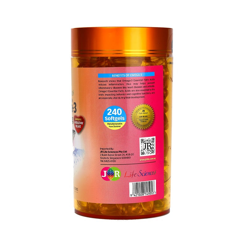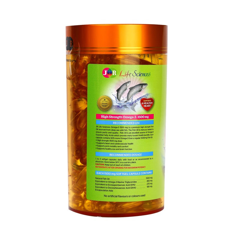 JR Life Sciences Omega-3 1500mg: Fish Oil is an excellent source of Omega-3 Essential Fatty Acids which provide many known health benefits. Omega-3 fatty acids are essential fatty acids which can only be obtained through diet as our bodies cannot make it. They are highly concentrated in the brain and appear to be important for cognitive function especially during fetal development. EPA and DHA may help to promote healthy lipid level, maintain healthy cardiovascular system and blood circulation.