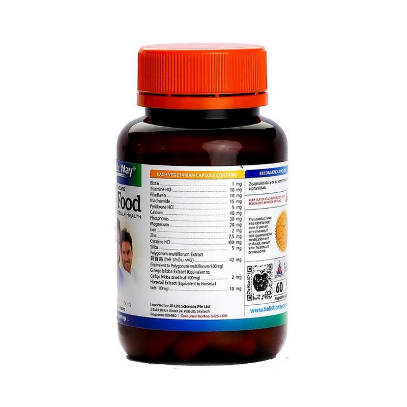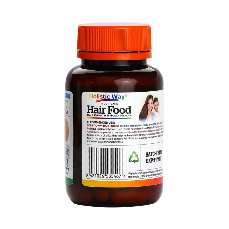 Holistic Way Hair Food is specially formulated using a potent mix of herbs and nutrients that have been used to help nourish scalp and hair follicles. It may help stimulate healthy hair growth and may help the hair retain its natural colour. Horsetail is a rich natural source of Silica that helps enhance hair strength and Ginkgo Biloba enhances blood flow to the scalp. It also contains hé sh?u w?, a widely used Chinese herb popular for the remedy of gray hair and hair loss.