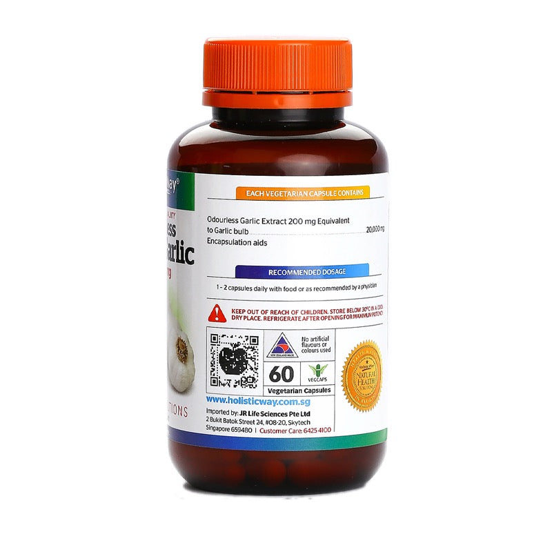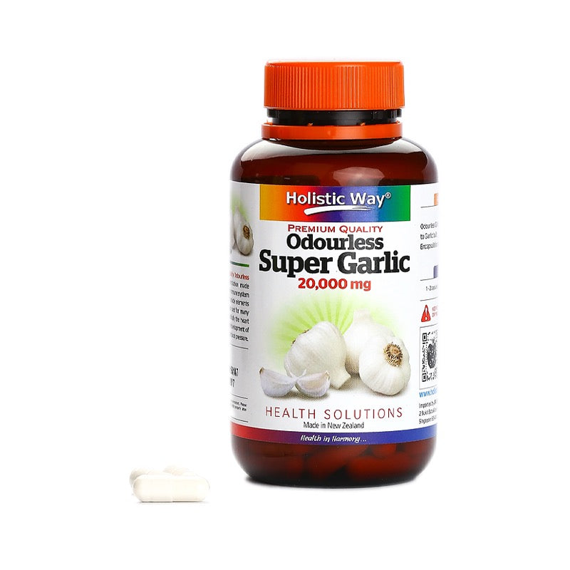 Holistic Way Odourless Super Garlic is a high strength formulation made from Odourless Garlic Extract. Garlic supports the immune system thus increasing the body’s resistance to harmful outside elements. Garlic has been used to support the circulatory system specifically the heart and blood. Each vegetarian capsule contains: