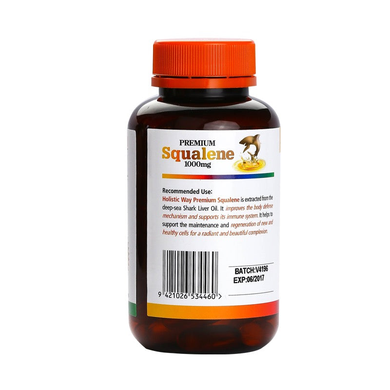 Holistic Way Squalene is extracted from the deep-sea Shark Liver Oil. It may help improve the body’s defense mechanism and support the immune system. It may also support the maintenance and regeneration of new and healthy cells in the body for a more radiant and beautiful complexion. Each softgel contains:
