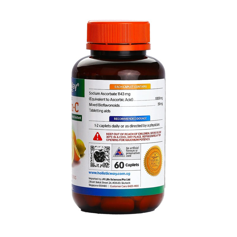 Holistic Way Non-Acidic Vitamin-C 1000mg contains sodium ascorbate (1143mg) and mixed bioflavonoids (50mg) that may promote the absorption and effects of Vitamin-C in the body. Vitamin-C supports healthy immune system functioning and may stimulate collagen growth. This non-acidic antioxidant formulation may also promote the maintenance of healthy capillaries, skin, bones, gums and teeth. It also supports wound healing and prevent free radical damage in the body.