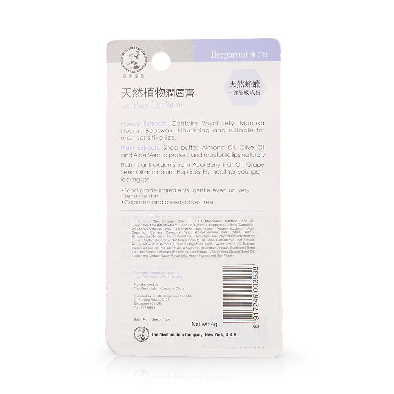 Lip Pure Lip Balm contains Royal Jelly, Manuka Honey, Beeswax extracts which are nourishing and suitable for most sensitive lips. With Shea Butter, Almond Oil, Oilive Oil and Aloe Vera extratcs, it helps to protect and moisturize lips naturally.