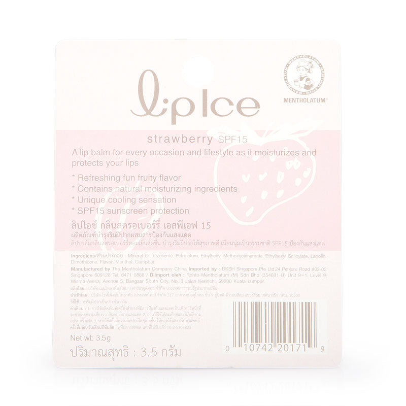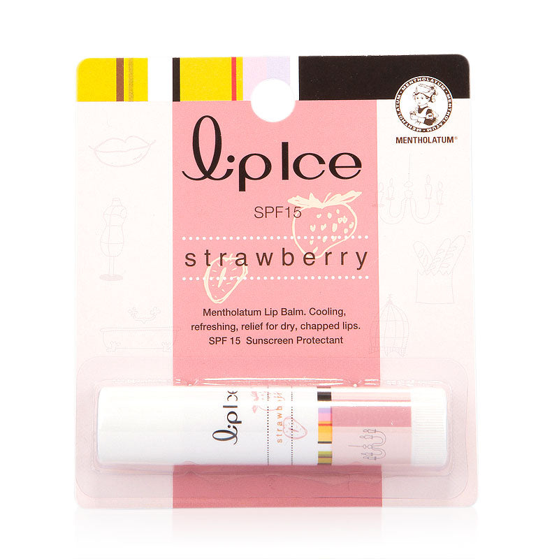 Mentholatum LipIce Strawberry Lip Balm cools, refreshes and provides relief for dry, chapped lips. It also contains SPF 15 as a sunscreen protectant for your lips. Containing natural moisturizing ingredients, it has an unique cooling sensation.