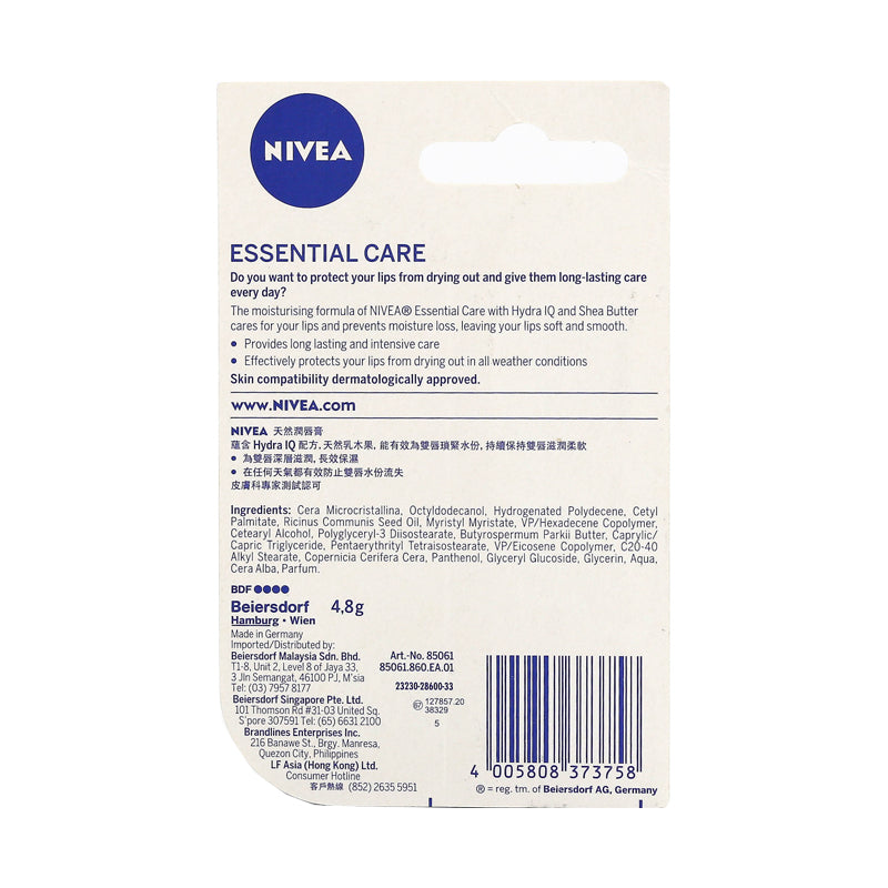 With shea butter and Hydra IQ, NIVEA Essential Care prevents your lips from moisture loss leaving them soft and smooth.