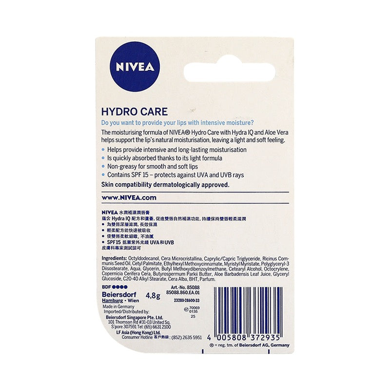 The moisturising formula of NIVEA Hydro Care with Hydra IQ and Aloe Vera helps support the lips's natural moisturising process, leaving a light and soft feeling.