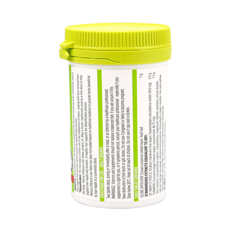Swisse Ultiboost Liver Detox provides herbs beneficial to liver health, which helps detoxification. Detoxification: It contains St. Mary’s thistle, traditionally used in Western Herbal Medicine as a liver tonic to...