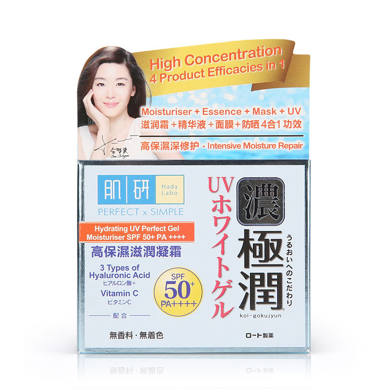 Hada Labo is a skin care line researched & developed by Rohto Pharmaceutical Co. Japan and The Mentholatum Co. With a philosophy 'Perfect X Simple', Hada Labo uses only the purest ingredients that are beneficial to the skin, with no unnecessary addictives & manufactured under strict pharmaceutical standards. Hada Labo Hydrating UV Perfect Gel Moisturizer with SPF 50+ PA++++ contains a formula that contains high ingredient concentration equivalent to 4 skincare products with no compromise to results. Hada Labo Proprietary Hyaluronic Acids replenish, lock and store long-lasting moisture for smooth bouncy skin. HA is a natural component found on our skin that can store water up to 6 to 20x its weight. Purest Vitamin C helps increase collagen production, repair fine lines and rejuvenates skin with healthy glowing radiance. Superb UV filters provides long-lasting and sun-stable protection. Unique property allows absorption of active ingredients while staying lightly on skin's surface without clogging pores. Skin PH is balanced without causing irritation. Free of fragrances, mineral oil and colorant.