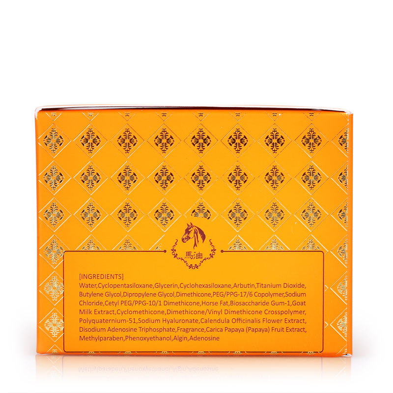 High Quality Germany Horse Oil is a strong moisturizer which is easily and gently penetrated into skin to repair the skin texture. It locks moisture within the skin, lightens pigmentation, smoothens wrinkles and lines on both the face and eye area. With Pure Goat Milk, it also provides the skin with the best nutrients, keeping skin firm, bright and soft. It also contains Arbutin, a Whitening Ingredient, that will brighten up skin tone instantly and brings out the translucency of the skin by penetrating deeply. It helps to lighten pigments and dark spots with its Marigolds Extract and Vitamin A, which are both good anti-oxidants. It also calms skin and promotes renewal of skin cells by strengthening them. Papaya extracts, a brightening ingredient found in the cream not only cleanses your skin but also makes the skin glowas it contains rejuvenating enzymes that helps to exfoliate the skin and provide a glowing complexion.