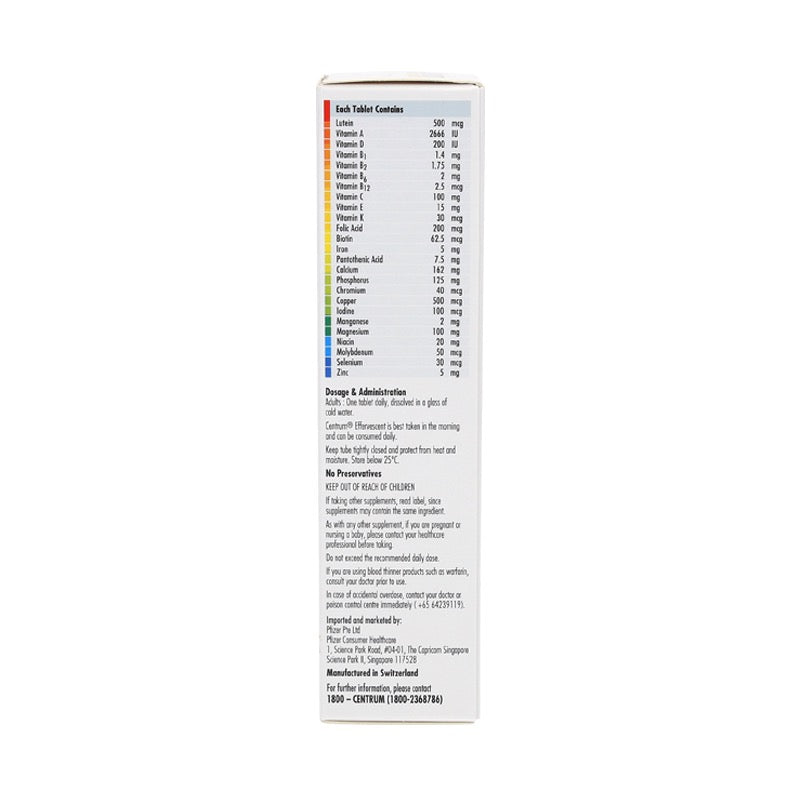 Centrum® Effervescent is a quick and refreshing way to get your daily essential vitamins and minerals. Complete from A to Zinc, Centrum® Effervescent is packed with 24 vitamins and minerals. Taken regularly every morning, it helps to maintain healthy immunity, energy level & metabolism. This ensures your body gets all the necessary nutrition to keep you at your daily best.