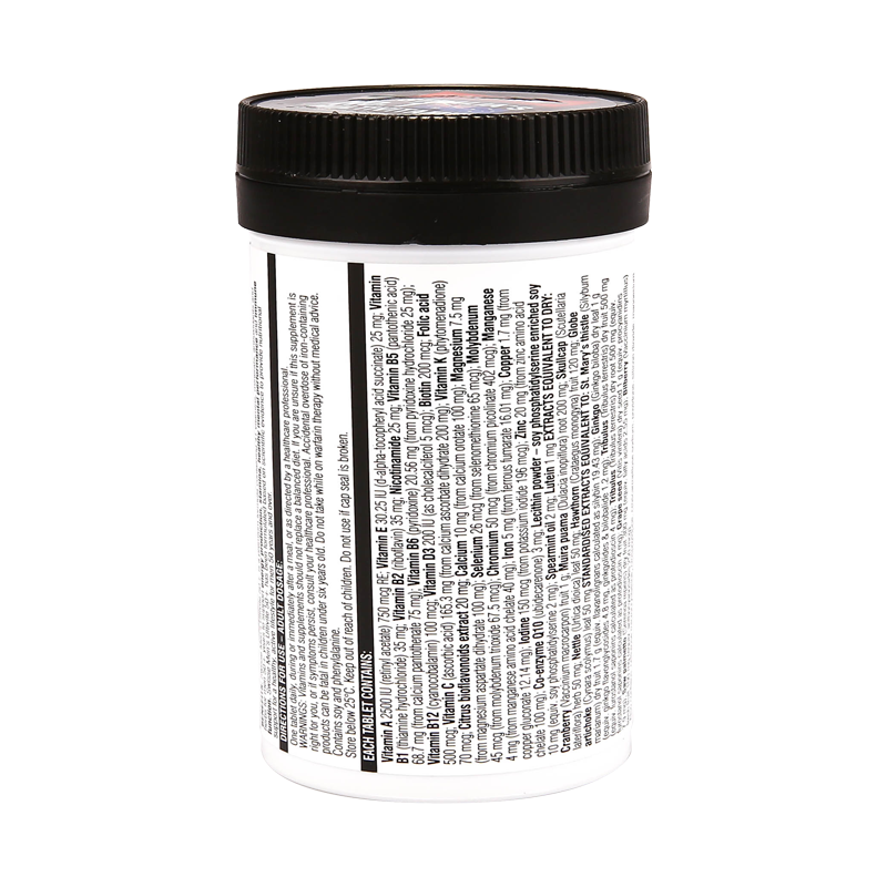 Vitamins and minerals are involved in many biochemical processes in the body and as such have a part to play in the health of nearly every organ in the body. Siberian ginseng has been shown to improve physical and mental responses particularly where there is fatigue and low energy. It can help to restore and strengthen the immune response. Iodine is important for the normal functioning of the thyroid gland as it is an essential nutrient required for the synthesis of thyroid hormones. Thyroid hormones affect almost every cell in the body and regulate oxygen use, metabolic rate and cellular metabolism. Chromium, an essential nutrient for sugar metabolism, works closely with insulin to facilitate the uptake of glucose into cells. Physical activity and a diet high in refined sugars can increase the loss of chromium from the body. The B group vitamins play an essential role in the metabolic processes...