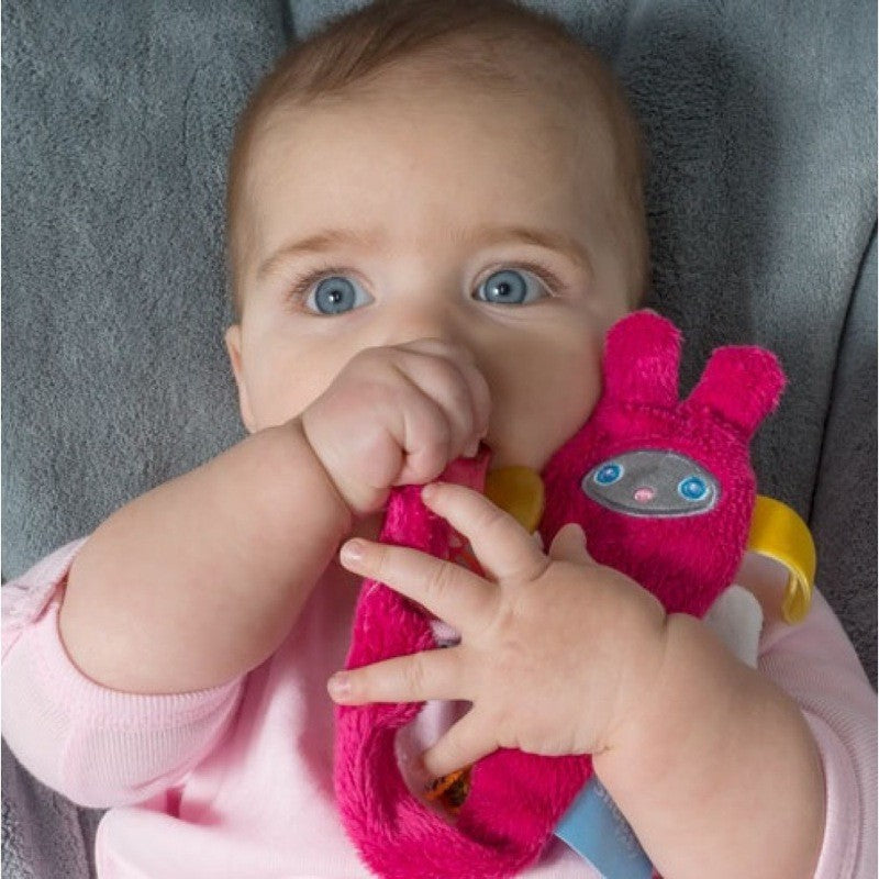 The Snoozebaby Pacifier Clip, Gila for girls, comes in a bright fuchsia colour so it won't get lost.