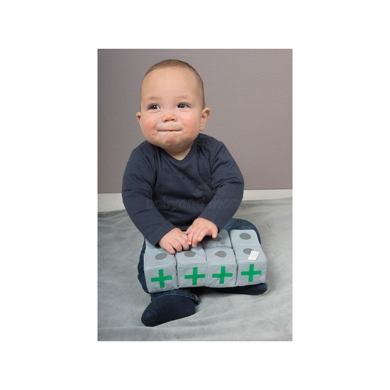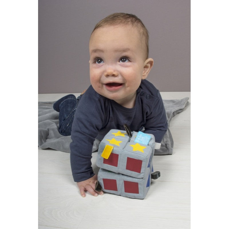 A collection of 8 fabric covered cubes, joined by fabric but each one also has a magnet. Play is encouraged by folding the cubes and making all sorts of different shapes and discovering the different coloured symbols on each of the sides.