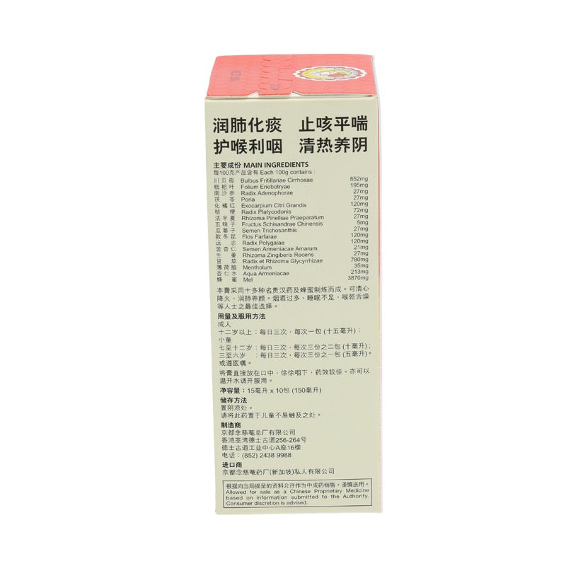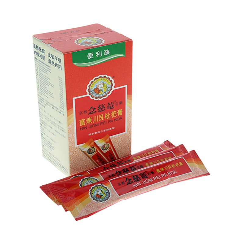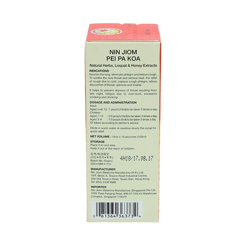 Nin Jiom Pei Pa Koa is made from natural herbs and honey. It's unique formula relieves cough, reduces phlegm, soothes sore throat and restores voice loss. Made in Hong Kong under strict quality and control Nin Jiom Pei Pa Koa has been trusted for generations globally. It can be taken everyday to nourish your lungs. It originated more than a century ago and continues to be the world's most popular Pei Pa Koa. Convenient sachet pack, perfect for office, travel or simply for daily convenience.