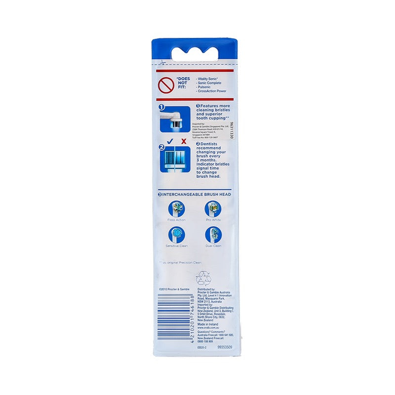 Oral-B Precision Clean EB20 Brush Heads are designed with an Advanced Bristle System to remove plaque and clean deep between teeth and below the gum line. Each brush head is hygienically sealed for convenient storage and has Indicator Bristles to signal when its time to change your brush head. It comes with interdental tips to penetrate hard to reach areas.
