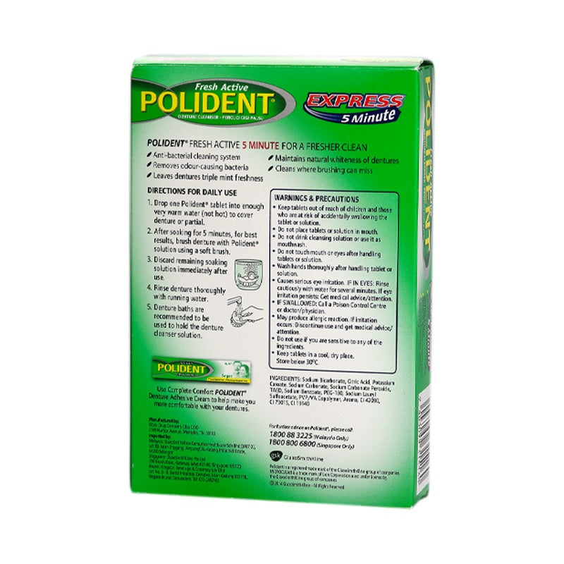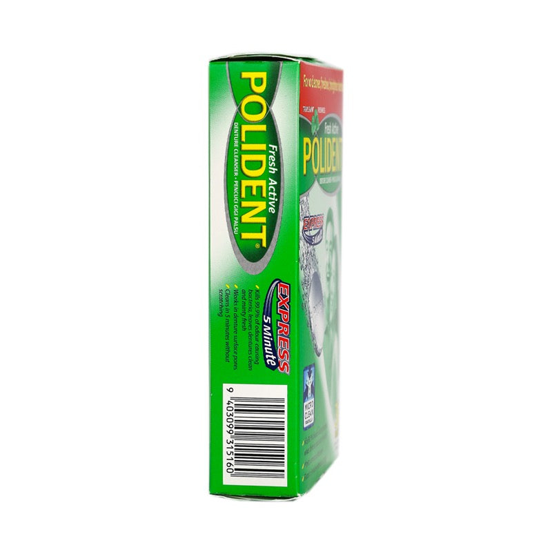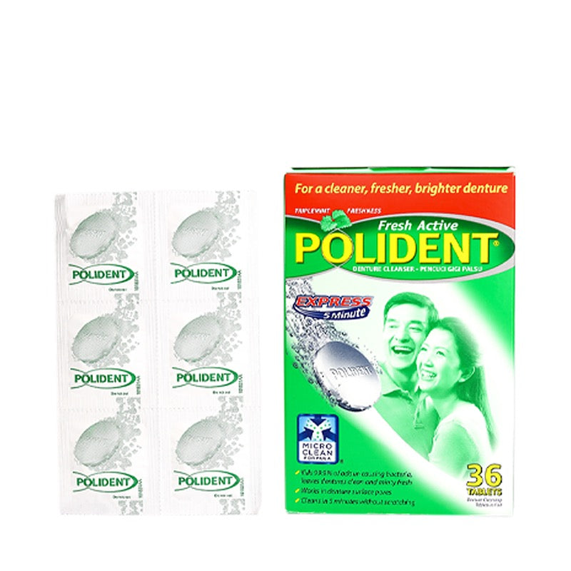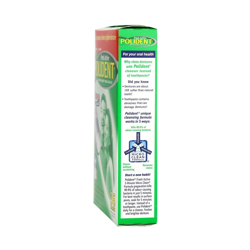 Unlike toothpaste, Polident Denture Cleanser Tablet is specially designed just for dentures and partials--giving you fresh, thorough clean without leaving scratches where bacteria can hide and grow. Choose the denture cleanser that’s right for you. Polident Denture Cleanser Tablets are intended to remove food particles, stains, germs, and plaque from dental appliances such as full plate and partial dentures by action outside the body. The formulation contains bleaching agents, a surfactant, an enzyme, and antimicrobial agents. These ingredients work together to loosen and separate adherent substances from denture surfaces, to eliminate stains
