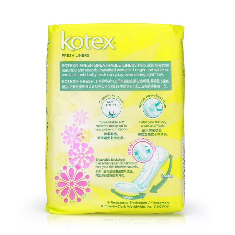 KOTEX® FRESH BREATHABLE LINERS help skin breathe naturally and absorb unwanted wetness. Longer and wider so you feel confidently fresh all day, even during light flow