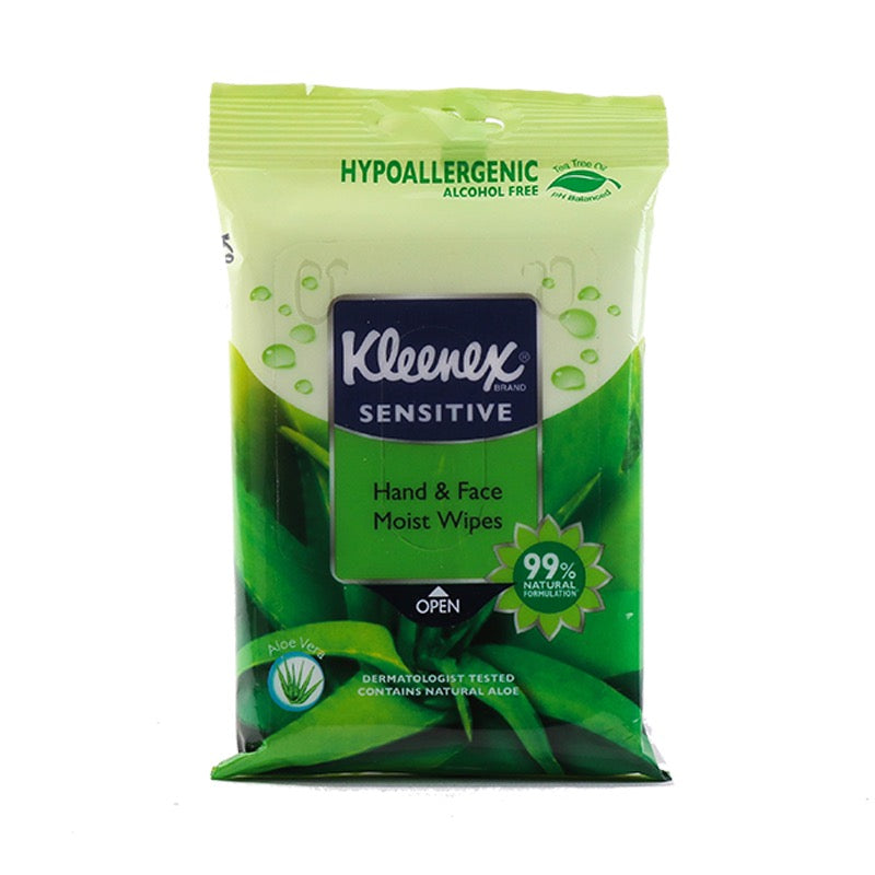 Kleenex® Sensitive Hand& Face Moist Wipes has been dermatologist tested and contains natural aloe. It is hypoallergenic, suitable for sensitive skin, alcohol free and safe for children.