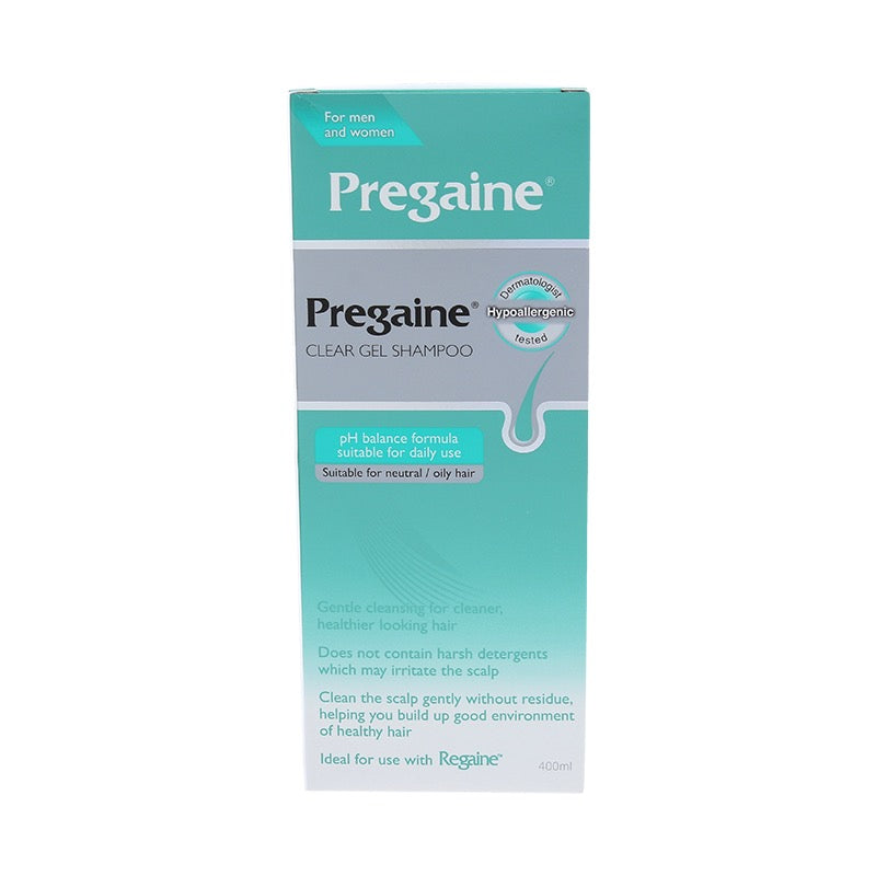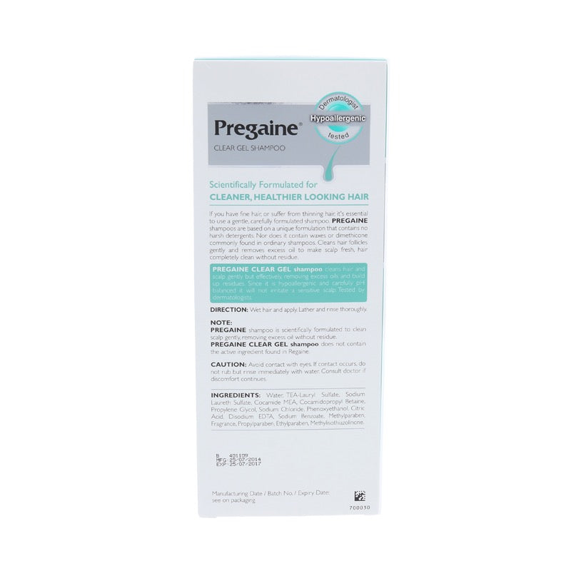 PREGAINE CLEAR GEL Shampoo is scientifically formulated for cleaner, healthier looking hair. It does not contain waxes or dimethicone commonly found in ordinary shampoos. Cleans hair follicles gently & removes excess oil to make scalp fresh, hair completely clean without residue. Tested by dermatologists. Ideal for use with Regaine Hair Loss Treatment Solution.