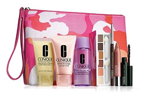 Clinique 2015 Fall 8 Pcs Spring Skin Care & Makeup Gift Set (A $85 Value). Includes: (1) Dramatically Different Moisturizing Lotion+, (1) Moisture Surge Overnight Mask, (1) Take the Day Off Makeup Remover, (1) High Impact Mascara in Black, (1) Quickliner for Eyes Intense in Intense Chocolate, (1) Chubby Stick in Whole Lotta Honey, (1) 6 colors Eyeshadow Palette: (AJ Bronze Satin, 03 Morning Java, 07 At Dusk, 02 Black Honey, 1W Peach Pop, AH Ivory Bisque), and (1) pink camo-print fabric cosmetics bag.