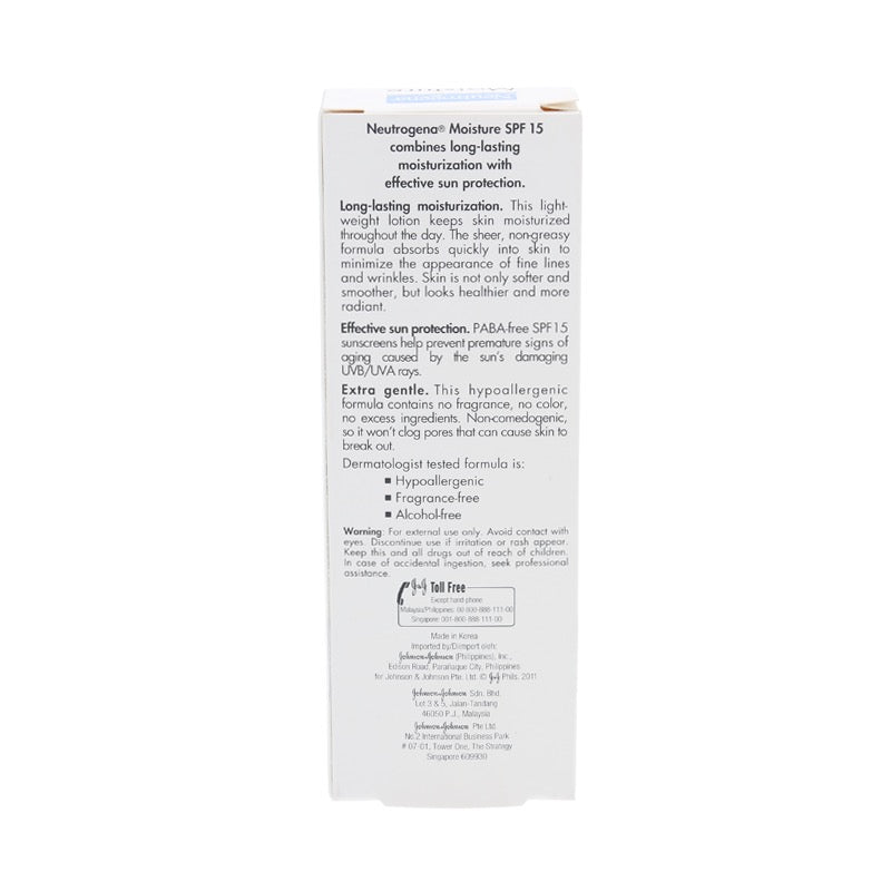 Neutrogena Moisture SPF 15 combines long-lasting moisturization with effective sun protection. This light-weight lotion keeps skin moisturized throughout the day. The sheer, non-greasy formula absorbs quickly into the skin to minimize the appearance of fine lines and wrinkles. Skin is not only softer and smoother, but looks healthier and more radiant. Effective sun protection. PABA-free SPF 15 sunscreens help prevent premature signs of aging caused by the sun's damaging UVB/UVA rays.