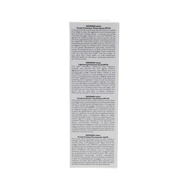 Depiderm White Fluide SPF 30 brightens the complexion,hydrates and combats the first signs of aging while protecting the skin against external aggressions such as UV rays and free radicals. It works Ideally as a make-up base with a very light and non greasy texture. With a high protection of SPF 30, it has a lightening effect and reveals the skin radiance and prevents/reduces fine lines at the same time.