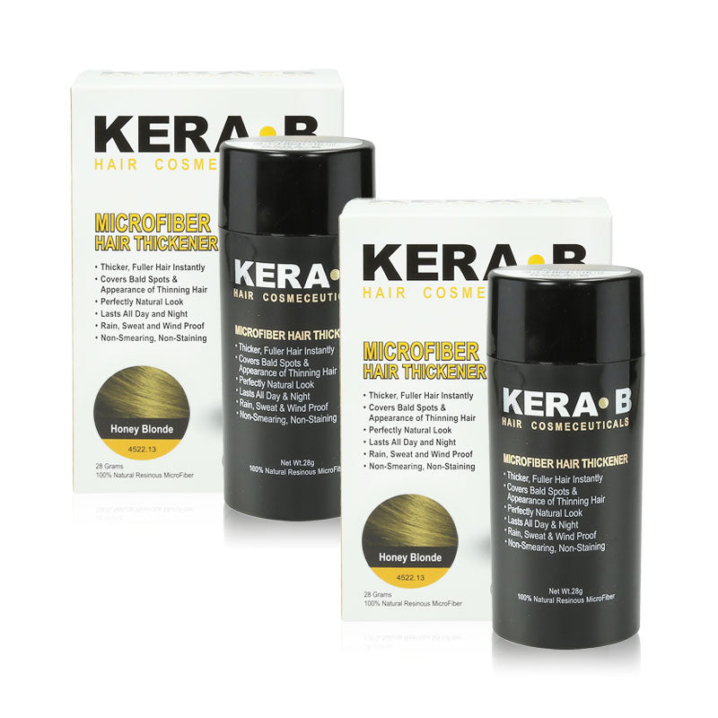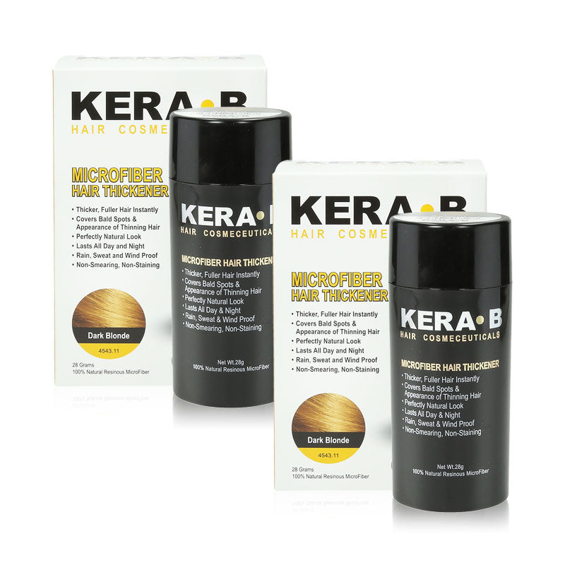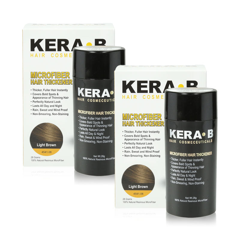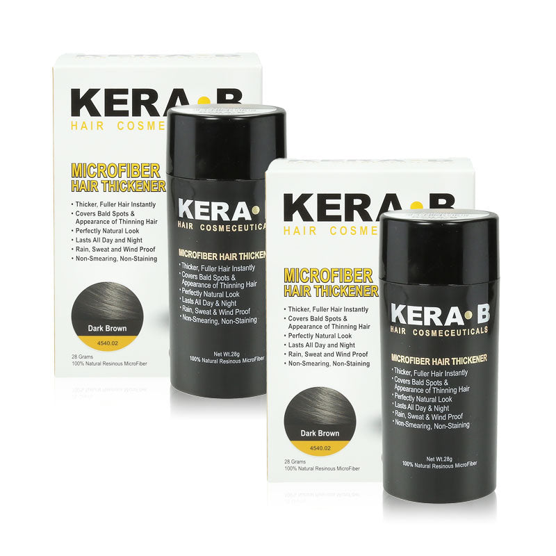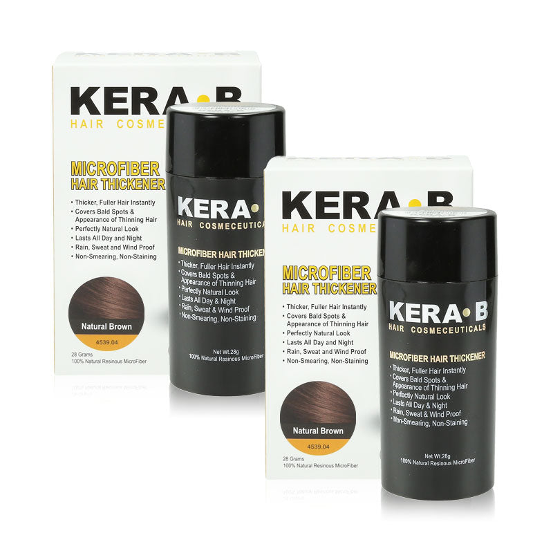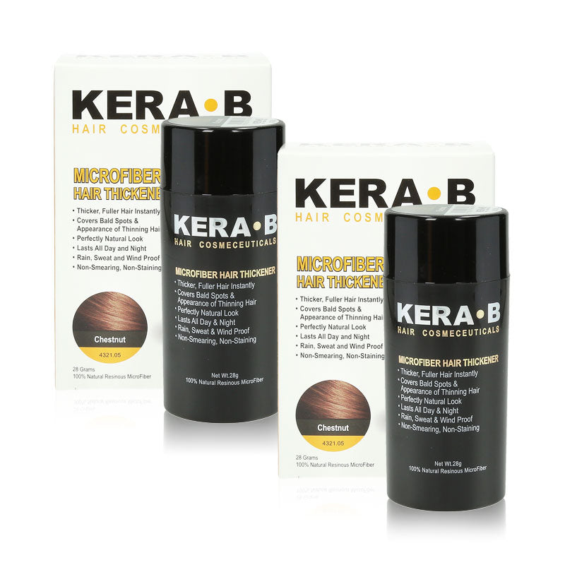 Kera B is an advanced microfiber hair thickener that gives you thicker, fuller, attractive looking hair instantly. It works seamlessly to cover thinning areas and bald spots with a completely natural look. The dermatologist tested formula contains 100% natural, statically charged microfiber that bonds onto hair without adhesives. It is rain, sweat and wind proof lasting all day and night until washed off with shampoo.