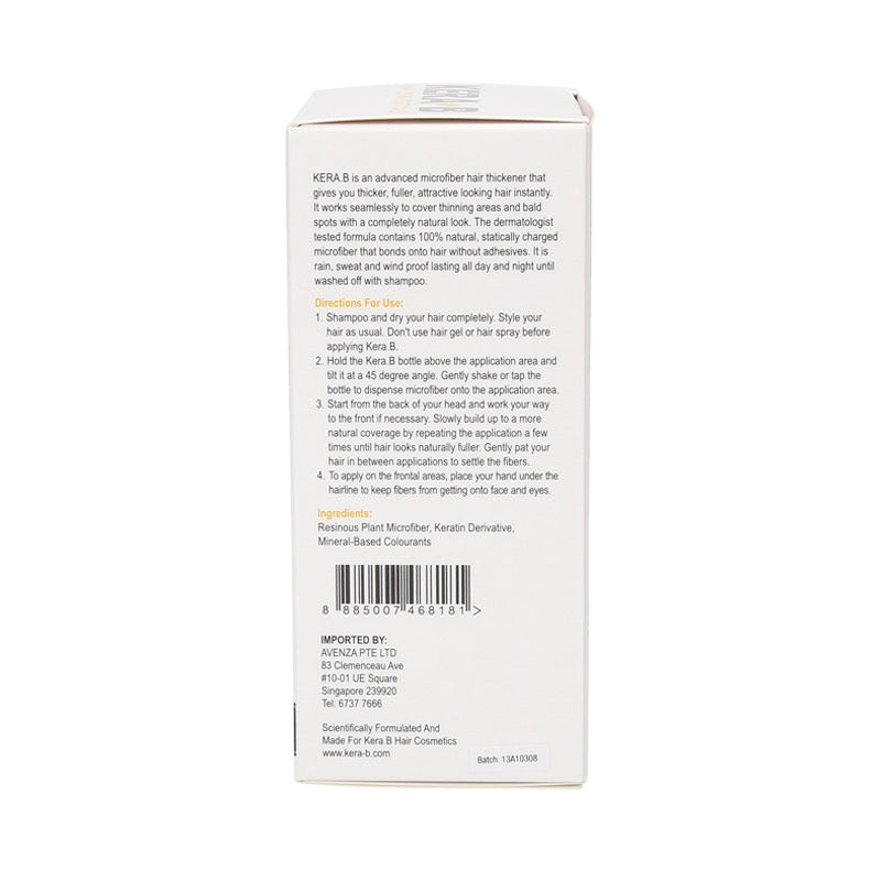 Kera B is an advanced microfiber hair thickener that gives you thicker, fuller, attractive looking hair instantly. It works seamlessly to cover thinning areas and bald spots with a completely natural look. The dermatologist tested formula contains 100% natural, statically charged microfiber that bonds onto hair without adhesives. It is rain, sweat and wind proof lasting all day and night until washed off with shampoo.