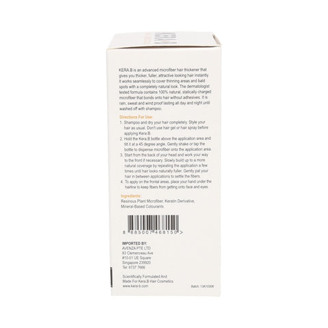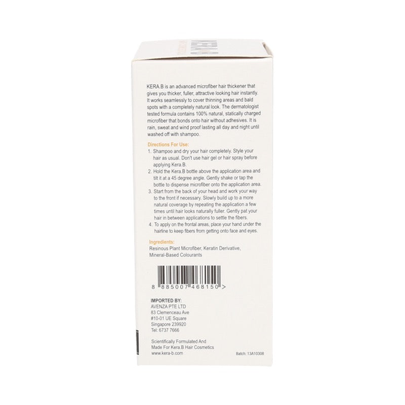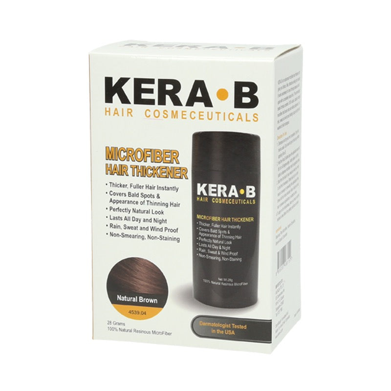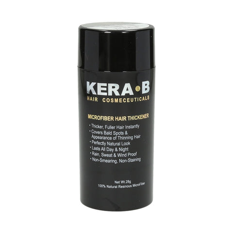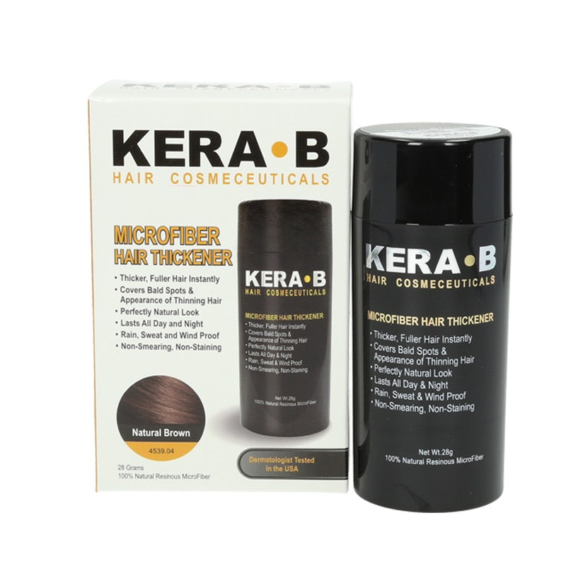 Kera B is an advanced microfiber hair thickener that gives you thicker, fuller, attractive looking hair instantly. It works seamlessly to cover thinning areas and bald spots with a completely natural look. The dermatologist tested formula contains 100% natural, statically charged microfiber that bonds onto hair without adhesives. It is rain, sweat and wind proof lasting all day and night until washed off with shampoo.