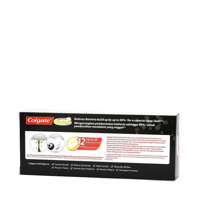 Colgate Total Charcoal Deep Clean reduces bacteria build up by up to 90%* for a superior deep clean** * vs regular fluoride toothpaste 12 hours after brushing ** vs regular...